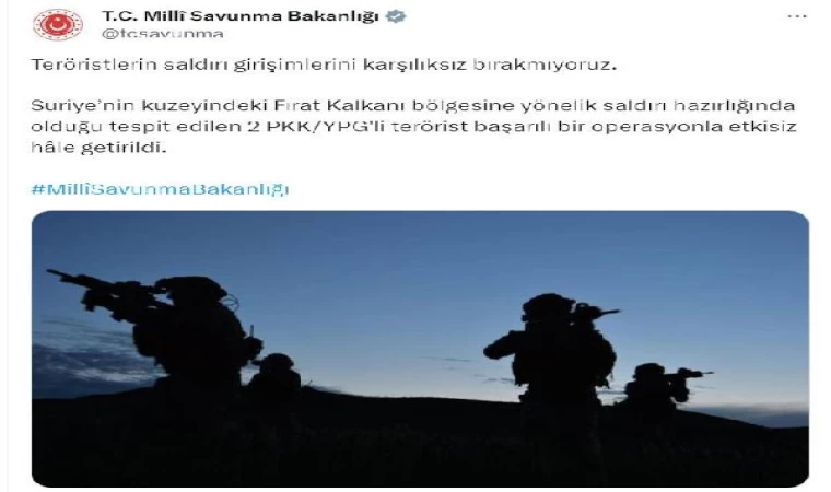 Bakanlığın sosyal medya hesabından yapılan açıklamada, "Teröristlerin saldırı girişimlerini karşılıksız bırakmıyoruz. Suriye’nin kuzeyindeki Fırat Kalkanı bölgesine yönelik saldırı hazırlığında olduğu tespit edilen 2 PKK/YPG'li terörist başarılı bir operasyonla etkisiz hale getirildi" denildi. (DHA)