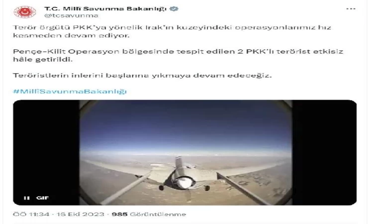 ANKARA, (DHA)- MİLLİ Savunma Bakanlığı (MSB), Pençe-Kilit Operasyon bölgesinde tespit edilen 2 PKK’lı teröristin etkisiz hale getirildiğini açıkladı.