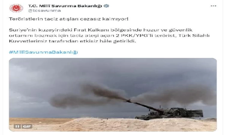 Bakanlığın sosyal medya hesabından yapılan açıklamada, "Teröristlerin taciz atışları cezasız kalmıyor! Suriye'nin kuzeyindeki Fırat Kalkanı bölgesinde huzur ve güvenlik ortamını bozmak için taciz ateşi açan 2 PKK/YPG'li terörist, Türk Silahlı Kuvvetlerimiz tarafından etkisiz hale getirildi" denildi. (DHA)