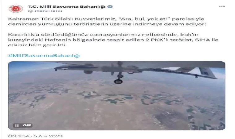 Bakanlığın sosyal medya hesabından yapılan açıklamada, "Kahraman Türk Silahlı Kuvvetlerimiz, 'Ara, bul, yok et' parolasıyla demirden yumruğunu teröristlerin üzerine indirmeye devam ediyor. Kararlılıkla sürdürdüğümüz operasyonlarımız neticesinde, Irak'ın kuzeyindeki Haftanin bölgesinde tespit edilen 2 PKK'lı terörist, SİHA ile etkisiz hale getirildi" denildi. (DHA)