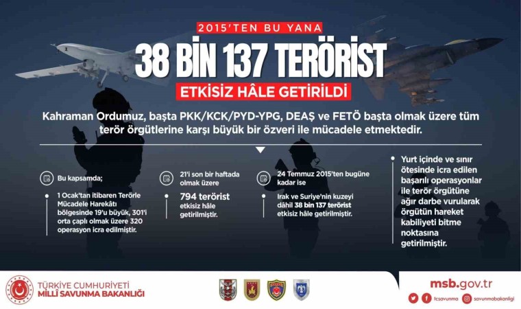 MİLLİ SAVUNMA BAKANLIĞI, 24 TEMMUZ 2015’TEN BUGÜNE KADAR IRAK VE SURİYE’NİN KUZEYİ DAHİL 38 BİN 137 TERÖRİSTİN ETKİSİZ HALE GETİRİLDİĞİNİ DUYURDU. BAKANLIK AYRICA 1 OCAKTAN BU YANA TERÖRLE MÜCADELE HAREKÂTI BÖLGESİNDE 19’U BÜYÜK, 301’İ ORTA ÇAPLI OLMAK ÜZERE TOPLAM 320 OPERASYON İCRA EDİLEREK 21’İ SON BİR HAFTADA OLMAK ÜZERE 794 TERÖRİSTİN ETKİSİZ HALE GETİRİLDİĞİNİ AÇIKLADI.
