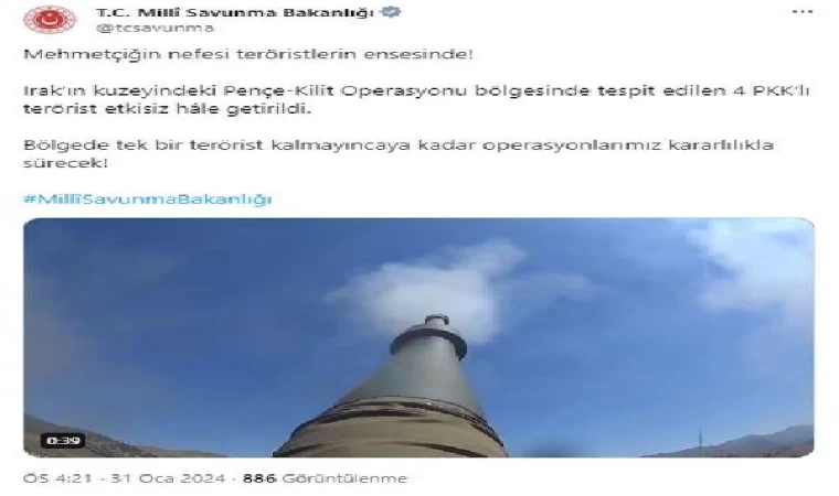 ANKARA, (DHA)- MİLLİ Savunma Bakanlığı (MSB), Pençe-Kilit operasyonu bölgesinde 4 PKK’lı teröristin etkisiz hale getirildiğini açıkladı.