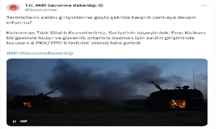 Bakanlığın sosyal medya hesabından yapılan açıklamada, "Teröristlerin saldırı girişimlerine güçlü şekilde karşılık vermeye devam ediyoruz. Kahraman Türk Silahlı Kuvvetlerimiz, Suriye'nin kuzeyindeki Fırat Kalkanı bölgesinde huzur ve güvenlik ortamını bozmak için saldırı girişiminde bulunan 4 PKK/YPG'li teröristi etkisiz hale getirdi" denildi. (DHA)