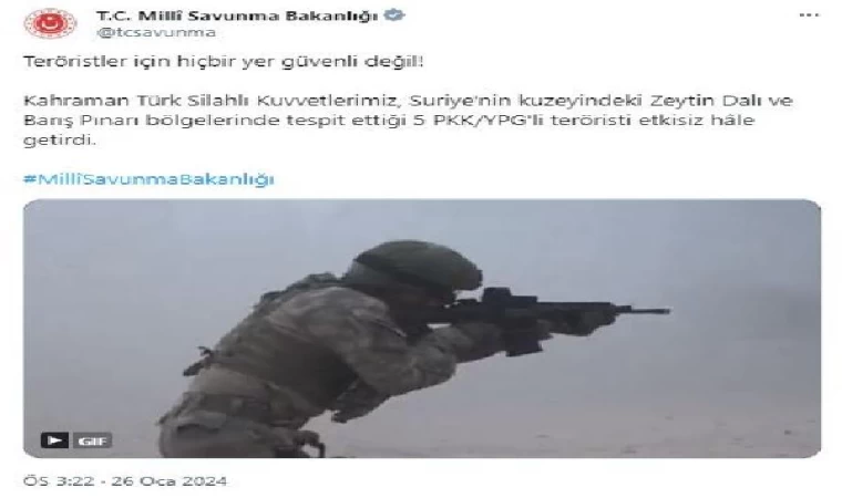 Bakanlığın sosyal medya hesabından yapılan açıklamada, "Teröristler için hiçbir yer güvenli değil. Kahraman Türk Silahlı Kuvvetleri’miz, Suriye'nin kuzeyindeki Zeytin Dalı ve Barış Pınarı bölgelerinde tespit ettiği 5 PKK/YPG'li teröristi etkisiz hale getirdi" denildi. (DHA)