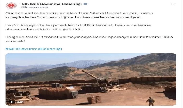 ANKARA, (DHA)- MİLLİ Savunma Bakanlığı (MSB), Irak'ın kuzeyinde 5 PKK'lı teröristin etkisiz hale getirildiğini açıkladı.
