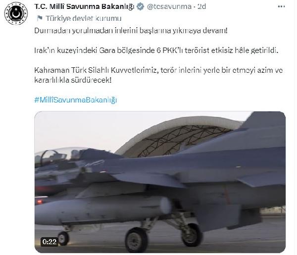 ANKARA, (DHA)- MİLLİ Savunma Bakanlığı, Irak’ın kuzeyindeki Gara bölgesinde 6 PKK’lı teröristin etkisiz hale getirildiğini duyurdu.
