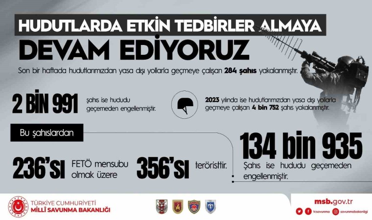 Sınır güvenliği ile ilgili açıklamalarda bulunan Albay Aktürk, hudut hattında ilave tedbirler alındığını hatırlatarak, “Sınırlarımızın ve halkımızın güvenliği için hudutlarımızda alınan ilave ve etkin tedbirler sayesinde; Son bir haftada hudutlarımızdan yasa dışı yollarla geçmeye çalışan 284 şahıs yakalanmıştır. Bu şahıslardan 9’u teröristtir. 2 bin 991 şahıs ise hududu geçemeden engellenmiştir. 2023 yılında ise hudutlarımızdan yasa dışı yollarla geçmeye çalışan 4 bin 752 şahıs yakalanmıştır. Bu şahıslardan 236’sı FETÖ mensubu olmak üzere 356’sı teröristtir. 134 bin 935 şahıs ise hududu geçemeden engellenmiştir. Ayrıca, son bir haftada icra edilen operasyonlarda 172 kilogram uyuşturucu ve 860 adet hap ele geçirilmiştir. Yılbaşından bu yana icra edilen operasyonlarda ise toplam 4 bin 803 kg uyuşturucu ve bin 911 adet hap ele geçirilmiştir” açıklamasında bulundu.