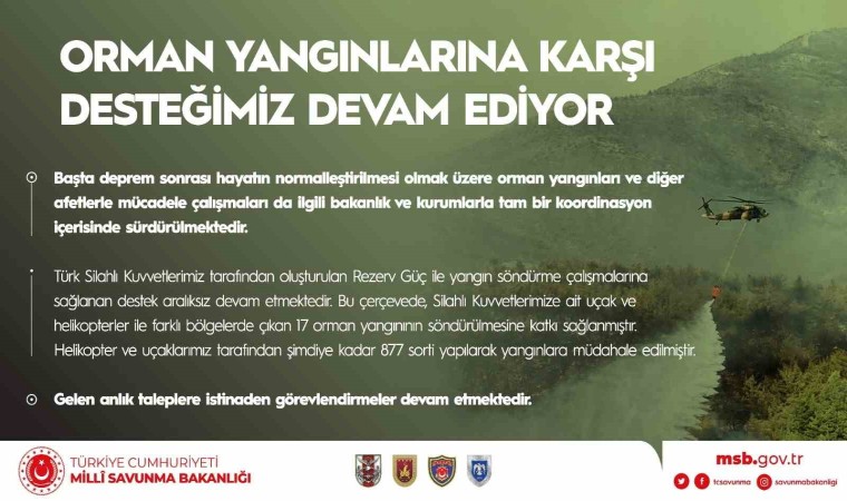 TSK’nın orman yangınlarına verdiğini desteğe dikkati çeken Albay Aktürk, “Türk Silahlı Kuvvetlerimiz tarafından oluşturulan Rezerv Güç ile yangın söndürme çalışmalarına sağlanan destek aralıksız devam etmektedir. Bu çerçevede, Silahlı Kuvvetlerimize ait uçak ve helikopterler ile farklı bölgelerde çıkan 17 orman yangınının söndürülmesine katkı sağlanmıştır. Helikopter ve uçaklarımız tarafından şimdiye kadar 877 sorti yapılarak yangınlara müdahale edilmiştir. Gelen anlık taleplere istinaden görevlendirmeler devam etmektedir” açıklamasında bulundu.
