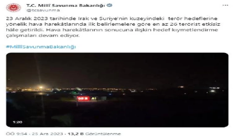 Bakanlığın sosyal medya hesabından yapılan açıklamada, "23 Aralık 2023 tarihinde Irak ve Suriye'nin kuzeyindeki terör hedeflerine yönelik hava harekatlarında ilk belirlemelere göre en az 26 terörist etkisiz hale getirildi. Hava harekatlarının sonucuna ilişkin hedef kıymetlendirme çalışmaları devam ediyor" denildi. (DHA)