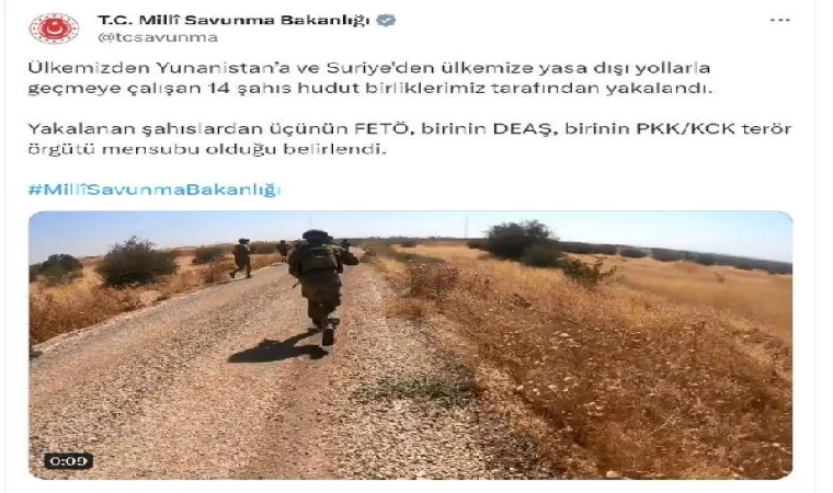 Bakanlığın sosyal medya hesabından yapılan açıklamada, "Ülkemizden Yunanistan'a ve Suriye'den ülkemize yasa dışı yollarla geçmeye çalışan 14 şahıs hudut birliklerimiz tarafından yakalandı. Yakalanan şahıslardan üçünün FETÖ, birinin DEAŞ, birinin PKK/KCK terör örgütü mensubu olduğu belirlendi" denildi. (DHA)