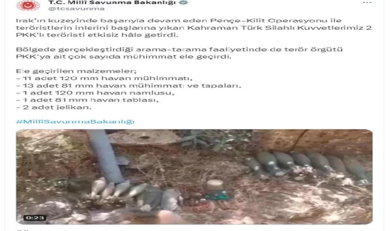 Milli Savunma Bakanlığı, Irak'ın kuzeyinde gerçekleştirilen Pençe-Kilit Operasyonu sırasında 2 PKK'lı teröristin etkisiz hale getirildiğini duyurdu. Bakanlık, Twitter hesabından yaptığı açıklamada, "Irak'ın kuzeyinde başarıyla devam eden Pençe-Kilit Operasyonu ile teröristlerin inlerini başlarına yıkan kahraman Türk Silahlı Kuvvetlerimiz 2 PKK'lı teröristi etkisiz hale getirdi" ifadesine yer verdi. Ayrıca, bölgedeki arama tarama faaliyeti sırasında terör örgütü PKK'ya ait çok sayıda mühimmatın ele geçirildiği belirtildi.
