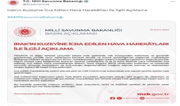 Bakanlıktan yapılan açıklamada, "PKK/KCK ve diğer terörist unsurları etkisiz hale getirerek Irak kuzeyinden halkımıza ve güvenlik güçlerimize yönelik terör saldırılarını bertaraf etmek ve hudut güvenliğimizi sağlamak maksadıyla; Birleşmiş Milletler Anlaşması'nın 51'inci maddesinden doğan meşru müdafaa haklarımız doğrultusunda, Irak'ın kuzeyi Gara bölgesinde bulunan terörist hedeflerine 13 ve 15 Eylül 2023'te hava harekatları icra edilmiş, bölücü terör örgütü tarafından kullanılan ve içerisinde sorumlu düzeyde teröristlerin de bulunduğu değerlendirilen mağara, sığınak, barınak ve depolardan oluşan toplam 31 hedef imha edilmiştir. İcra edilen harekatlarda azami oranda yerli ve milli mühimmat kullanılarak, çok sayıda terörist etkisiz hale getirilmiştir" denildi.