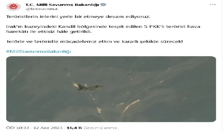Bakanlığın sosyal medya hesabından yapılan açıklamada, "Teröristlerin inlerini yerle bir etmeye devam ediyoruz. Irak'ın kuzeyindeki Kandil bölgesinde tespit edilen 5 PKK'lı terörist, hava harekatı ile etkisiz hale getirildi. Terörle ve teröristle mücadelemiz etkin ve kararlı şekilde sürecek" denildi. (DHA)