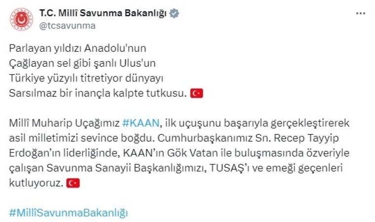 "Parlayan yıldızı Anadolu’nun, çağlayan sel gibi şanlı Ulus’un, Türkiye Yüzyılı titretiyor dünyayı, sarsılmaz bir inançla kalpte tutkusu. Millî Muharip Uçağımız KAAN, ilk uçuşunu başarıyla gerçekleştirerek asil milletimizi sevince boğdu. Cumhurbaşkanımız Sayın Recep Tayyip Erdoğan’ın liderliğinde, KAAN’ın Gök Vatan ile buluşmasında özveriyle çalışan Savunma Sanayii Başkanlığımızı, TUSAŞ’ı ve emeği geçenleri kutluyoruz."