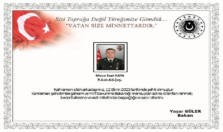 Bakanlıktan yapılan açıklamada, "Pençe-Kilit Operasyon bölgesinde bir üs bölgemize 12 Ekim 2023 tarihinde bölücü terör örgütü mensuplarınca yapılan taciz atışı sonucu Piyade Astsubay Kıdemli Çavuş Musa Esat Kaya şehit olmuştur. Bizleri derin bir acı ve üzüntüye boğan bu olayda hayatını kaybeden aziz şehidimize Allah'tan rahmet, kederli ailesine, Türk Silahlı Kuvvetleri ile asil milletimize başsağlığı ve sabır dileriz" denildi.