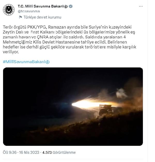 Bakanlığın Twitter hesabından yapılan açıklamada, "Terör örgütü PKK/YPG, Ramazan ayında bile Suriye'nin kuzeyindeki Zeytin Dalı ve Fırat Kalkanı bölgelerindeki üs bölgelerimize yönelik eş zamanlı havan ve ÇNRA atışları ile saldırdı. Saldırıda yaralanan 4 Mehmetçiğimiz Kilis Devlet Hastanesi'ne tahliye edildi. Belirlenen hedefler ise derhal güçlü şekilde vurularak teröristlere misliyle karşılık veriliyor" denildi. (DHA)
