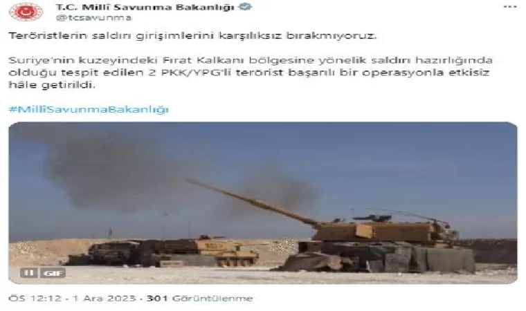 Bakanlığın sosyal medya hesabından yapılan açıklamada, "Teröristlerin saldırı girişimlerini karşılıksız bırakmıyoruz. Suriye’nin kuzeyindeki Fırat Kalkanı bölgesine yönelik saldırı hazırlığında olduğu tespit edilen 2 PKK/YPG'li terörist, başarılı bir operasyonla etkisiz hale getirildi" denildi. (DHA)