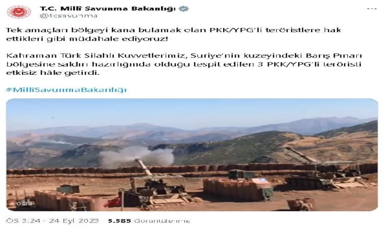 ANKARA, (DHA)- MİLLİ Savunma Bakanlığı (MSB), Suriye'nin kuzeyindeki Barış Pınarı Harekatı bölgesine saldırı hazırlığında olduğu tespit edilen 3 PKK/YPG'li teröristin etkisiz hale getirildiğini açıkladı.