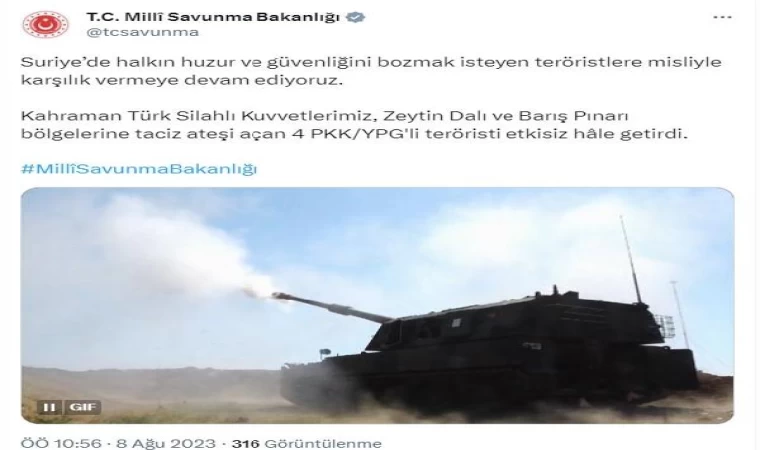 Bakanlığın sosyal medya hesabından yapılan açıklamada, "Suriye’de halkın huzur ve güvenliğini bozmak isteyen teröristlere misliyle karşılık vermeye devam ediyoruz. Kahraman Türk Silahlı Kuvvetlerimiz, Zeytin Dalı ve Barış Pınarı bölgelerine taciz ateşi açan 4 PKK/YPG'li teröristi etkisiz hale getirdi" denildi. (DHA)