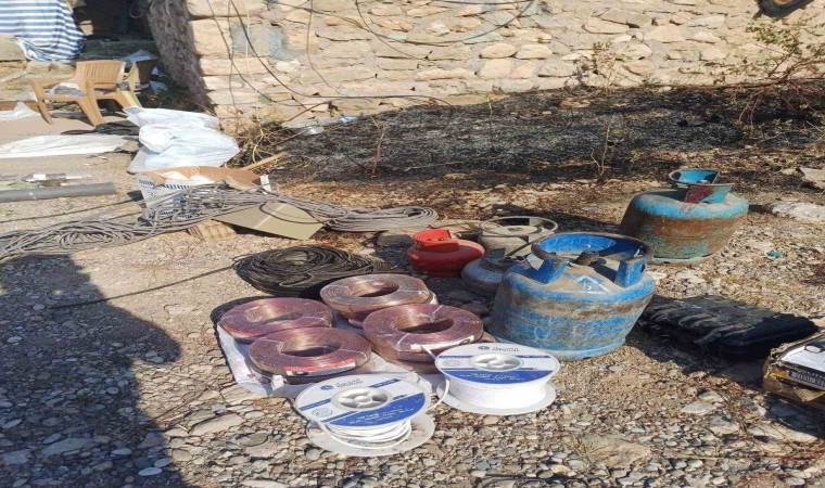 "1 adet RPG-7 roketatar, 2 adet RPG-7 mühimmatı, 3 adet sevk fişeği, 2 adet el bombası, 2 adet el dürbünü, 1 adet 12 x dürbün, 1 adet PTZ kamera, 9 adet telsiz, 3 adet kamera, 20 adet termal şemsiye, 2 adet silah dipçiği, 1 adet susturucu, 1 adet televizyon, 1 adet tuşlu telefon, 3 adet oyun cihazı CVD okur, 1 adet oyun konsolu, 1 adet oyun adaptörü, 1 adet aç konuş telefon diyafonu, 1 adet mini televizyon, 6 adet EYP yapımında kullanılan kablo, 1 çuval pil, 2 adet büyük tüp, 4 adet küçük tüp."