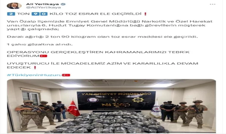 İçişleri Bakanı Ali Yerlikaya da operasyonla ilgili Twitter hesabından açıklama yaptı. Yerlikaya, "Van Özalp ilçemizde Emniyet Genel Müdürlüğü Narkotik ve Özel Harekat unsurlarıyla 6'ncı Hudut Tugay Komutanlığına bağlı görevlilerin müşterek yaptığı çalışmada; daralı ağırlığı 2 ton 90 kilogram olan toz esrar maddesi ele geçirildi. 1 şahıs gözaltına alındı. Operasyonu gerçekleştiren kahramanlarımızı tebrik ediyorum. Uyuşturucu ile mücadelemiz azim ve kararlılıkla devam edecek" dedi. (DHA)