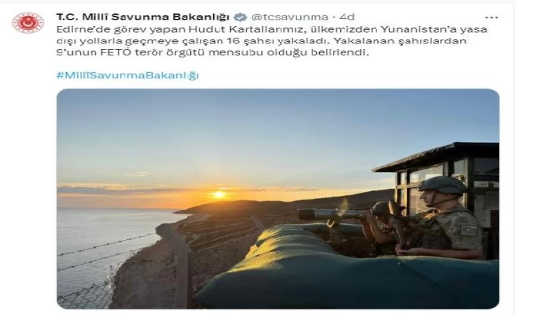 ANKARA, (DHA)- MİLLİ Savunma Bakanlığı, yasa dışı yollarla Türkiye’den Yunanistan’a geçmeye çalışan 9’u FETÖ mensubu, 16 kişinin yakalandığını duyurdu.