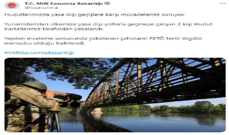 ANKARA, (DHA)- MİLLİ Savunma Bakanlığı (MSB), Yunanistan'dan Türkiye'ye yasa dışı yollarla geçmeye çalışan 2 FETÖ mensubunun yakalandığını duyurdu.