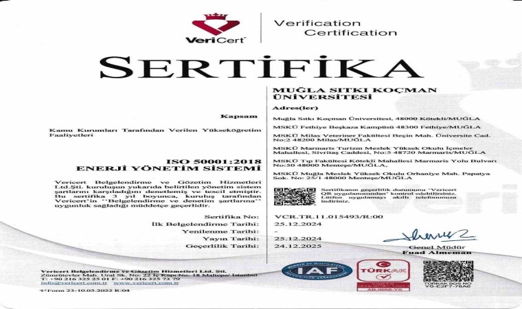 Muğla Sıtkı Koçman Üniversitesi (MSKÜ), Yapı İşleri ve Teknik Daire Başkanlığı koordinasyonunda yürütülen çalışmalar sonucunda sürdürülebilirliğin en temel unsurlarından enerji verimliliği konusunda önemli bir başarı ve değerlendirme ölçütü olan "TS EN ISO 50001 Enerji Yönetim Sistemi" sertifikasını almaya hak kazandı. Bu sertifika ile MSKÜ’nün enerji yönetimindeki sistematik yaklaşımı ve çevresel sorumluluğu tescillenmiş oldu.