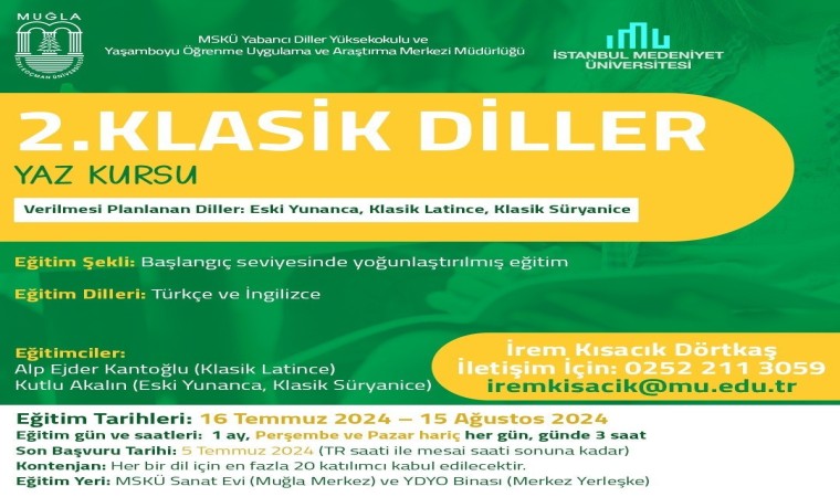 Muğla Sıtkı Koçman Üniversitesi (MSKÜ), 16 Temmuz-15 Ağustos tarihleri arasında 2’inci kez Klasik Diller Yaz Kursu’nu düzenleyecek. Geçen yıl büyük ilgi gören ve başarıyla tamamlanan kurs, bu yıl da Eski Yunanca, Latince ve Klasik Süryanice dillerini öğrenmek isteyenler için Muğla’nın Menteşe ilçesinde bulunan MSKÜ Sanat Evi’nde gerçekleşecek.
