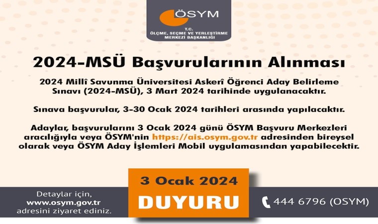 Öte yandan, 2024-MSÜ Askeri Öğrenci Aday Belirleme Sınavı’na ilişkin ayrıntılı bilgi https://www.osym.gov.tr/ adresinde yer alıyor. ÖSYM sınav takvimine göre 3 Mart’ta yapılacak sınavın sonuçlarının ise 28 Mart’ta açıklanması planlanıyor.