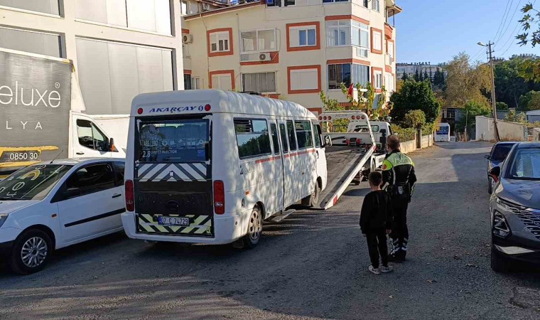 Manavgat Emniyet Müdürlüğü Trafik Denetleme Büro Amirliği ekiplerince Hasan Fehmi Boztepe Caddesi’nde gerçekleştirilen trafik uygulamasında durdurulan bir okul servisi aracının muayenesinin geçtiği, muayenesini yapılması için daha önce verilen süre içerisinde yapılmadığı belirlendi.