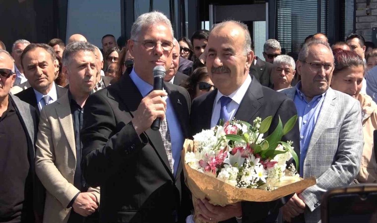 Konuşmaların ardından yeni ve eski belediye başkanları birbirlerine çiçek takdim etti.