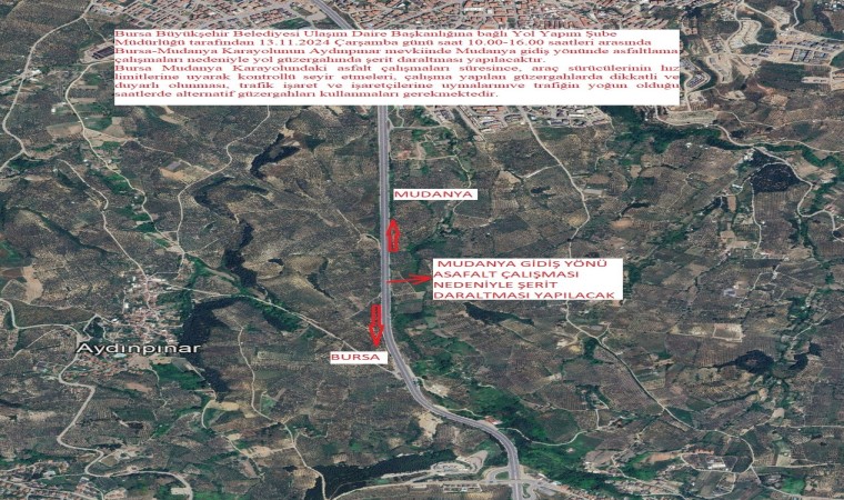 "Bursa Büyükşehir Belediyesi Ulaşım Daire Başkanlığına bağlı Yol Yapım Şube Müdürlüğü tarafından 13 Kasım 2024 Çarşamba günü saat 10.00 ile 16.00 saatleri arasında Bursa-Mudanya Karayolunun Aydınpınar mevkiinde Mudanya gidiş yönünde asfaltlama çalışmaları nedeniyle yol güzergahında şerit daraltması yapılacaktır. Bursa Mudanya Karayolundaki asfalt çalışmaları süresince, araç sürücülerinin hız limitlerine uyarak kontrollü seyir etmeleri, çalışma yapılan güzergahlarda dikkatli ve duyarlı olunması, trafik işaret ve işaretçilerine uymalarını ve trafiğin yoğun olduğu saatlerde alternatif güzergahları kullanmaları gerekmektedir."