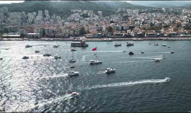 Cumhuriyet’in ilanının 100. yıl dönümü, tüm yurtta olduğu gibi Bursa’da da büyük coşkuyla kutlandı. Mudanya ilçesinde ise denizde onlarca vatandaş, tekneleriyle coşkuya ortak oldu. O anlar havadan görüntülendi.