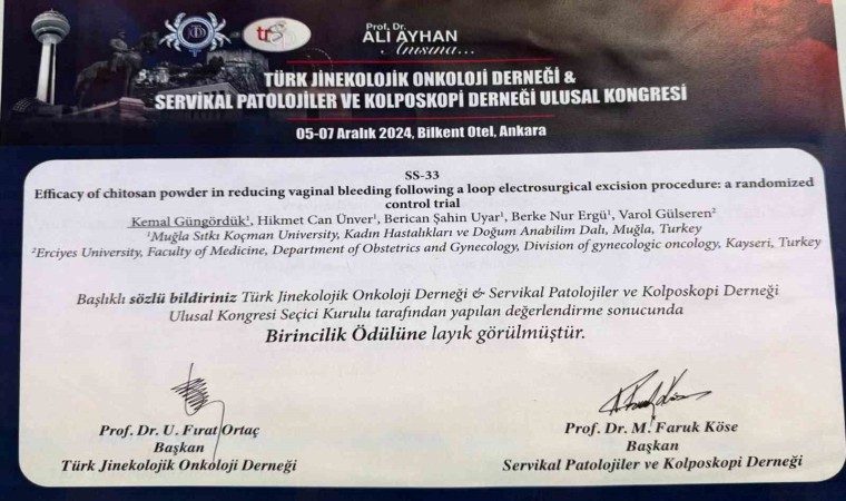 Türk Jinekolojik Onkoloji Derneği (TRSGO) ve Servikal Patolojiler ve Kolposkopi Derneği (TRSCCP) tarafından düzenlenen Ulusal Kongrede gerçekleştirilen bilimsel değerlendirmelerde Muğla Eğitim ve Araştırma Hastanesi Kadın Hastalıkları ve Doğum Kliniği Hekimlerimizden Jinekolojik Onkoloji Uzmanı Prof. Dr. Kemal Güngördük öncülüğünde Op. Dr. Hikmet Can Ünver, Araştırma Görevlisi Dr. Berican Şahin Uyar, Araştırma Görevlisi Dr. Berke Nur Ergü tarafından gerçekleştirilen çalışma ile Ulusal Kongrede Sözel Bildiri Birincilik ödülüne layık görüldüler.