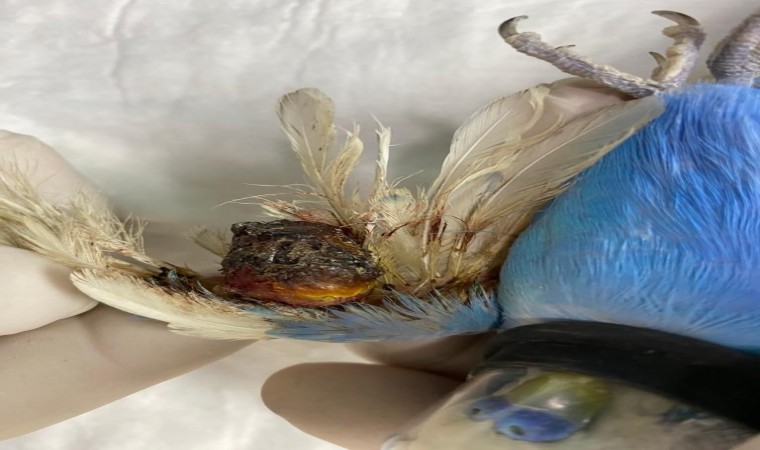 Zonguldak’ta iki buçuk yaşındaki muhabbet kuşunun kanadından fındık büyüklüğünde tümör alındı.