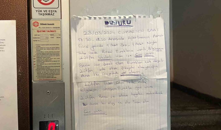 Eskişehir’de yaşayan ve muhasebeci Filiz Şen, geçtiğimiz cumartesi günü İbrahim Karaoğlanoğlu Caddesi üzerindeki evine oğluyla geldi. Elindeki maliyeti 1 milyon TL olan evrakları apartman girişindeki asansörün yanında unutup markete gitti. Yarım saat sonra marketten dönen Şen ve oğlu evrakları yerinde bulamadı. Mağdur olan Şen, eşyasını alan şahıslara o evrakların işlerine yarayamayacağını söyleyerek geri getirmeleri için seslendi.