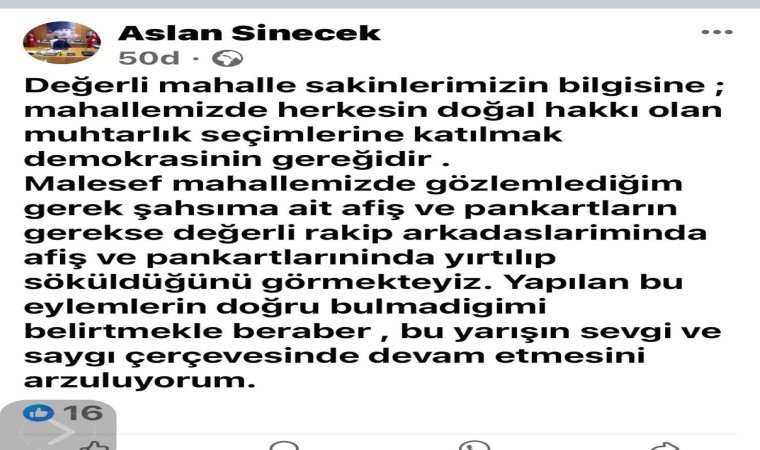Kendi afişinin de koparıldığını sosyal medyadan duyuran mevcut İncesu Yalı Mahallesi Muhtarı Aslan Sinecek, "Mahallemizde herkesin doğal hakkı olan muhtarlık seçimlerine katılmak demokrasinin gereğidir. Maalesef mahallemizde gözlemlediğim gerek şahsıma ait afiş ve pankartların, gerekse değerli rakip arkadaşlarımın da afiş ve pankartlarının yırtılıp söküldüğünü görmekteyiz. Yapılan bu eylemleri doğru bulmadığımı belirtmekle beraber, bu yarışın sevgi ve saygı çerçevesinde devam etmesini arzuluyorum" diye konuştu.