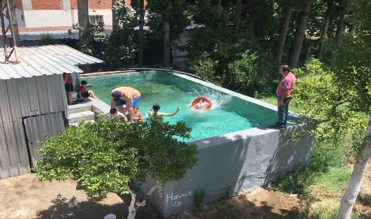 Muhtar Halitoğlu, “Aydın’da havaların 40 derece sıcak olması nedeniyle evimin önündeki havuzu suyla doldurdum. Çocuklar öğlen saatlerinde gelip yüzüyorlar. Çocuklar havuzda serinlerken ben de sürekli onları kontrol ediyorum. Havuzumuz herkese açıktır” dedi.