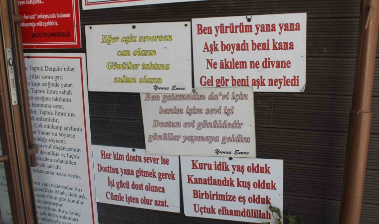 Eskişehir Odunpazarı ilçesi Deliklitaş Mahallesi Muhtarı Hüsnü Petek, muhtarlık ofisinin duvarına astığı Yunus Emre’nin özlü sözleriyle vatandaşların takdirini alıyor. 79 yaşındaki muhtar Petek, Eskişehirli olan Yunus Emre’ye sevgisini onun değerli özlü sözlerini asarak gösteriyor. Muhtarlık önünden geçen vatandaşlar da duvardaki özlü sözleri okuyarak ufuklarını genişletiyor.