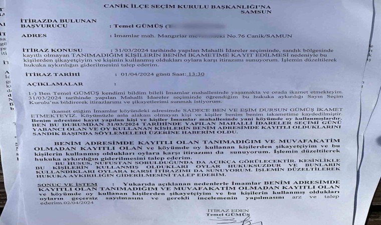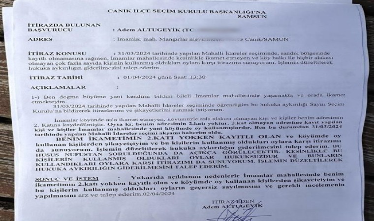 Canik ilçesi İmamlar Mahallesi’nde 31 Mart Mahalli İdareler Seçimlerinde 4 muhtar adayı yarıştı. Muhtar adaylarından 2’si seçimden sonra mahallerinde tanımadıkları kişilerin seçim günü oy verdiğini iddia ederek Canik İlçe Seçim Kuruluna itiraz etti. Muhtar adayları ve bazı mahalle sakinleri, mahallede hiç kullanılmayan veya olmayan yerlere ikamet verildiğini, bu şekilde 17 kişinin muhtarlık seçiminde oy kullandığını ileri sürerek, bunlar hakkında Samsun Cumhuriyet Başsavcılığına şikayette bulundu.