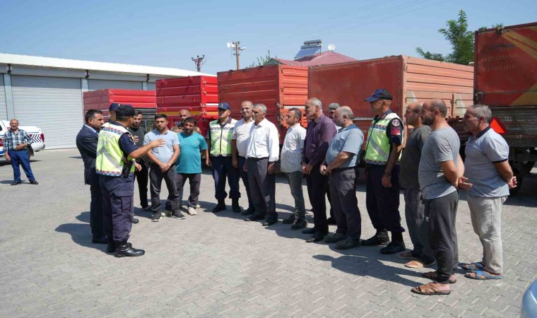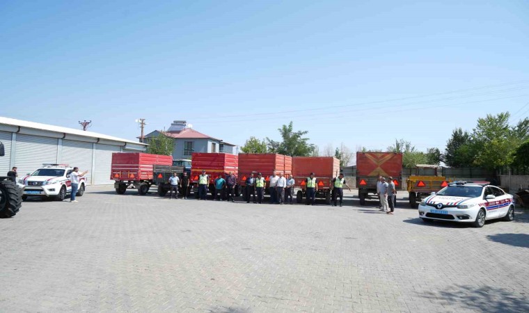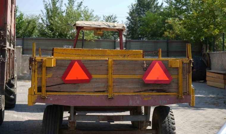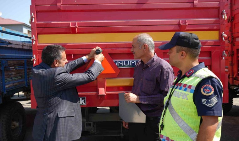 Muş’ta jandarma trafik ekipleri, trafik kazalarını azaltma ve gece görünürlüğü artırmaya yönelik "Reflektör Tak, Görünür Ol" projesi çerçevesinde Sungu Beldesinde bulunan 400 traktör römorkuna üçgen reflektör taktı.