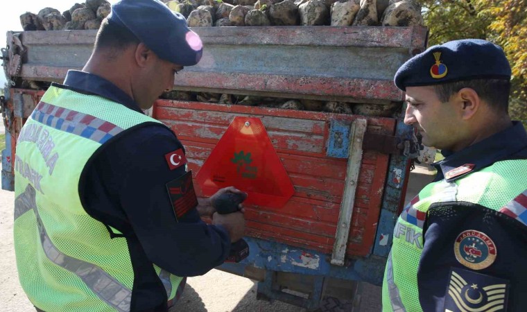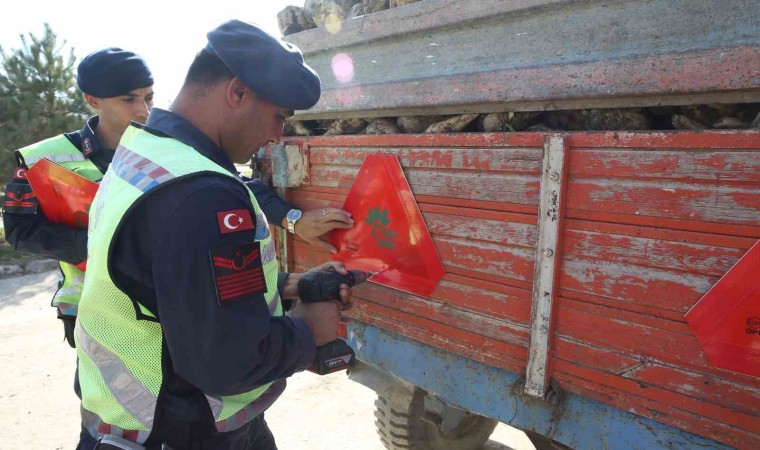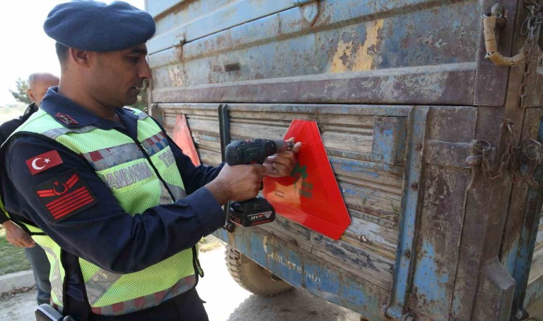 Muş’ta jandarma trafik ekipleri, trafik kazalarını azaltma ve gece görünürlüğü artırmaya yönelik "Reflektör Tak, Görünür Ol" projesi çerçevesinde bin 500 traktör römorkuna üçgen reflektör taktı.