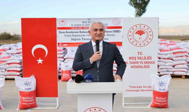 Muş Tarım ve Orman Müdürü Mehmet Gün ise "İlimiz 357 bin hektarlık bir tarım arazisine sahiptir. Bu da yüzde 41,2’yi oluşturmaktadır. Bunun içerisinde de 162 bin hektarlık alan sulanabilir bir durum var. 72 bin hektarlık bir alanda da sulama yapılmaktadır. 2023 verilerine göre 1 milyon 800 bin dekarlık bir alanda hububat ekimi gerçekleştirildi. 2023 yılında 2 etap şeklinde yapıldı. İlkbahar’da kuru fasulye, ay çekirdeği ve nohut gibi tohumlar yüzde 75 hibeyle çiftçilerimize dağıtıldı ve hasatları tamamlandı. Bu yıl iyi bir hasat elde ettik. İkinci etap olarak bakanlığımıza sunduğumuz buğday tohumu projesi kabul edilerek bugün çiftçilerimize dağıtacağız. Bu projeyle 4 yıl boyunca 262 bin dekarlık bir alanda bir ekim sağlandı. Bundan da 10 bin 459 çiftçimiz faydalandı. Şu anda dağıtacağımız 595 ton buğday tohumunu 23 bin 800 dekarlık bir alanda ekimi gerçekleşecek. Bundan da bin 200 çiftçimiz faydalanacak” ifadelerini kullandı.