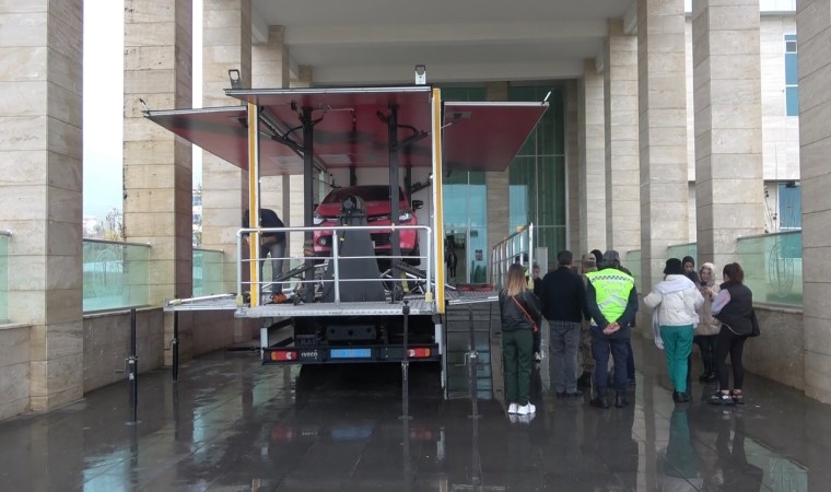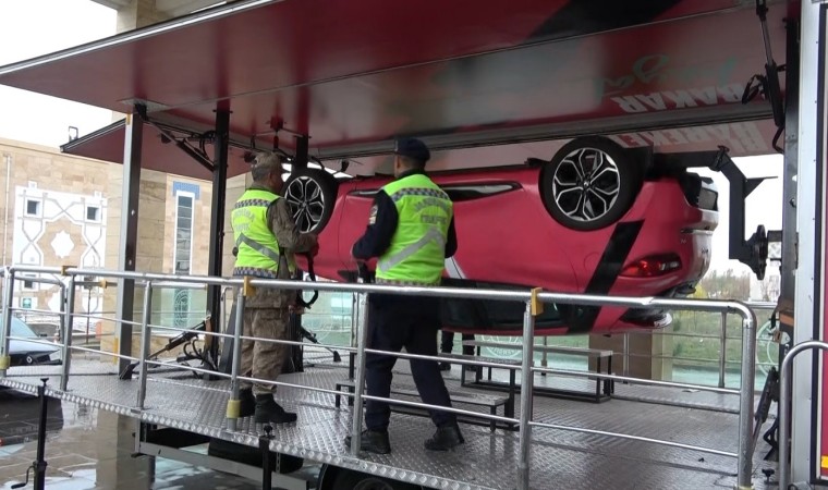Muş’ta Jandarma Genel Komutanlığı’na ait ‘Emniyet Kemeri Simülasyon Aracı’nda vatandaşlara uygulamalı trafik eğitimi verildi.