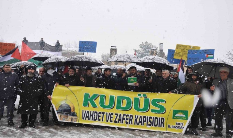 Cuma namazı sonrası Belediye Meydanı’nda toplanan kalabalık sloganlar atarak İsrail’e tepki gösterdi. Yoğun kar yağışının altında açıklama yapan HÜDA PAR İl Başkanı Mehmet Şirin Çağlayan, Gazze’de 77 gün içerisinde 20 bini aşkın sivilin şehit edildiğini ve bunların 8 binden fazlasının çocuk, 6 bin 200’ünün de kadınlardan oluştuğunu söyledi. 77 gündür Gazze’de bir soykırım yaşandığını söyleyen Başkan Çağlayan, “Diğer taraftan yüzde 70’i kadın ve çocuk olmak üzere 7 bin kardeşimiz de kayıp durumda. Kayıp olanların da şehit olduğu değerlendiriliyor. Allah kardeşlerimize rahmet eylesin ve şehadetlerini kabul etsin. Siyonist terör örgütü İsrail sivillerle birlikte insani görevlerini yapmaya çalışan insanlığın hizmetkârlarını da hedef alıyor. 7 Ekim’den bu yana 200’den fazla doktor, 97 gazeteci, 35 sivil savunma görevlisi ve yine yüzlerce sağlık çalışanı şehit edildi. Yine 10 binlerce kardeşimiz yaralandı. Yıkılan binalardan ve tahrip edilen altyapıdan, temiz su ve gıdaya erişememekten dolayı salgın hastalıklar baş göstermeye başladı. Yüz binlerce kardeşimiz de hasta durumdadır. Dünyanın gözleri önünde savaş suçu işleyen terör şebekesi, 53 hastaneyi, 102 ambulansı, 312 camiyi, 3 kiliseyi, 282 okul ve üniversiteyi ve 306 bin konutu kısmen veya tamamen tahrip etti. Altyapı tahrip edildi, un fabrikaları, ekmek fırınları, su depoları, yardım taşıyan kamyonlar bombalandı. Bütün bu cürümlere rağmen onları destekleyen batı dünyası tavrını değiştirmedi, desteğini çekmedi ve “İsrail’in kendisini savunma hakkı vardır” söylemiyle bu suçları meşrulaştırmaya çalıştı. Oysa Siyonist terör örgütü İsrail ve destekçisi batılı ülkelerin Gazze’de yaptıkları bir savunma değildir. Vahşettir, katliamdır ve soykırımdır. Dünyada ve uluslararası metinlerde savaş suçu ve insanlığa karşı suç olarak tarif edilen fiillerin tamamı bu katiller sürüsü tarafından işlenmiştir” diye konuştu.