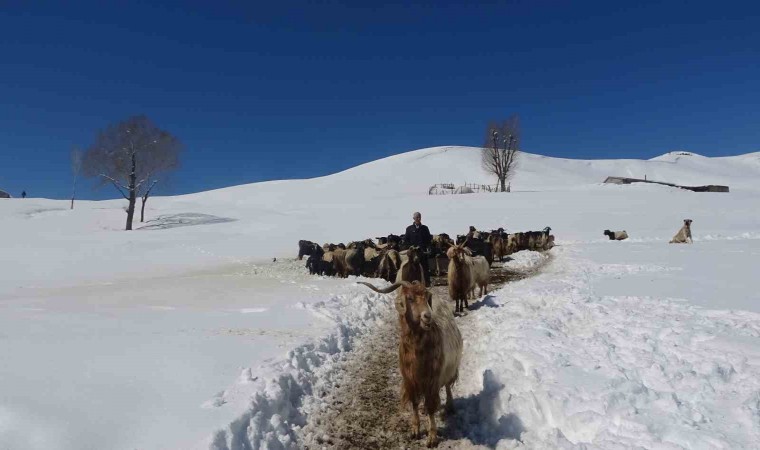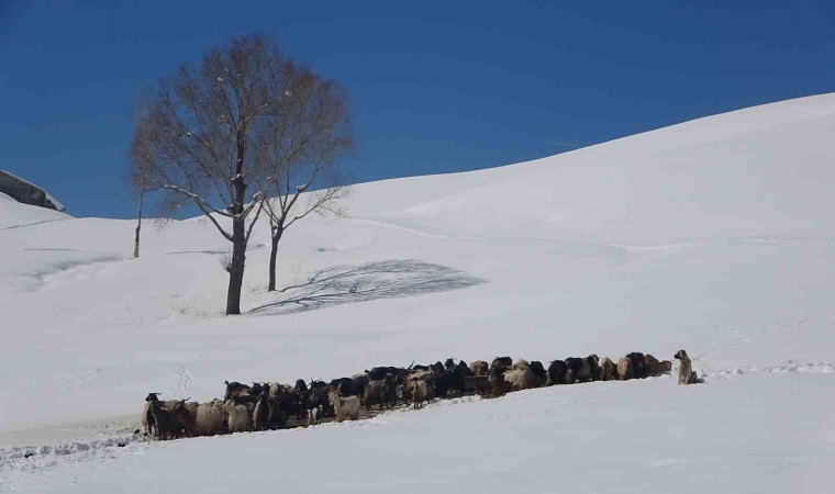 Muş’ta ilkbahar mevsimi gelmesine rağmen yüksek kesimlerde bir haftadır devam eden kar yağışı hayatı olumsuz etkiledi. Köyde geçimini hayvancılıkla sağlayan besiciler, kar üzerinde hayvanlarına günde iki kez yem vererek besliyor. Merkeze 50 kilometre mesafedeki Bin 800 rakımlı Yukarıyongalı köyünde kar kalınlığı 1 metreye ulaşırken tek katlı evler ve ahırlar ise kar altında kaldı. Köy sakinleri, ev ve ahırlarının önünde biriken karları küreklerle temizledi.