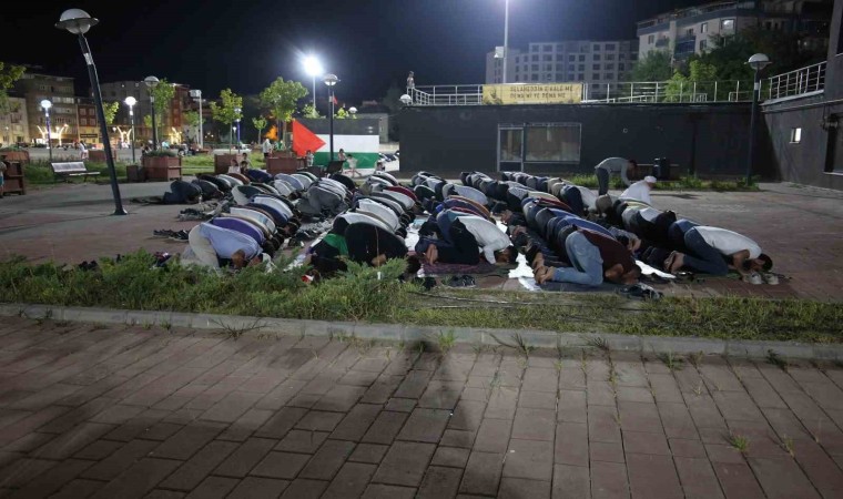 Muş Kent Meydanı’nda bir araya gelen Mescidi Aksa Platformu üyeleri ve bazı vatandaşlar burada yatsı namazını kıldıktan sonra İsrail saldırılarını protesto ederek Filistin için namaz kılıp dua etti.