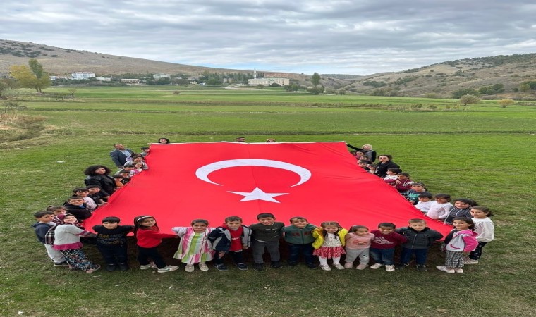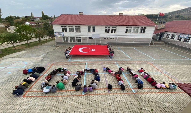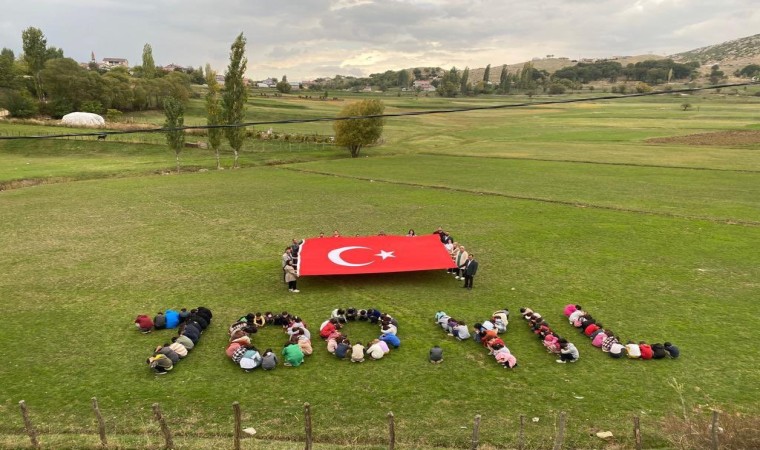 Bitlis’in Mutki ilçesinde Cumhuriyet’in 100’üncü yılına özel öğrenciler tarafından oluşturulan Türkiye haritası ile ‘100’ yazılı koreografi havadan da görüntülendi.