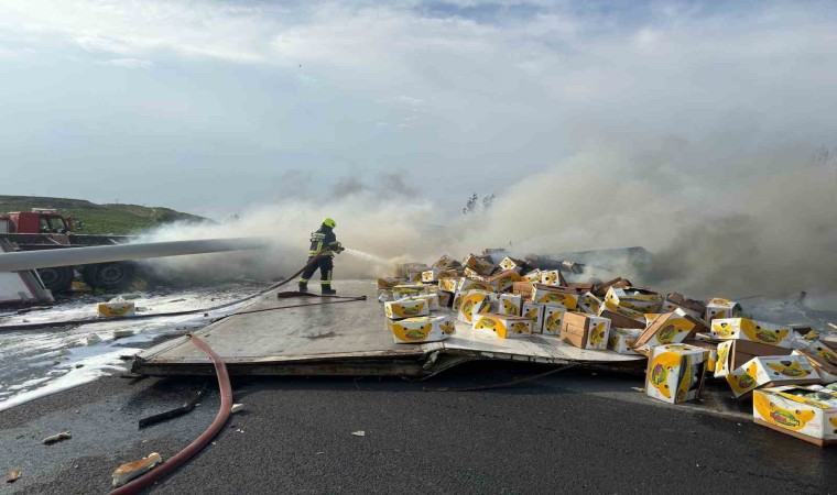 Mersin’in Tarsus ilçesinde muz yüklü tırın devrilerek alev aldığı kazada sürücüsü yaralandı.
